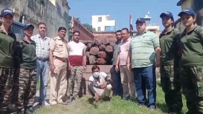 ऐसे पकड़ा लकड़ी तस्कर। पूरे मामले के अनुसार देर रात्रि खटीमा रेंज के वनक्षेत्राधिकारी महेश चंद्र जोशी को मुखबिर ने सूचना दी कि एक वाहन महिंद्रा पिकअप 26एटी-1873 में खैर की लकड़ी लादकर यूपी के न्यूरिया पीलीभीत की ओर जा रहा है। रेंजर जोशी ने टीम गठित कर वन कर्मियों को न्यूरिया पीलीभीत मार्ग की ओर भेजा गया। वन कर्मियों द्वारा न्यूरिया पीलीभीत मार्ग पर रात्रि गश्त कर वाहन चेकिंग शुरू की गई। इसी बीच न्यूरिया पीलीभीत को जाने वाले रास्ते पर ग्राम चंदेली फॉर्म टेढ़ाघाट के पास एक पिकअप वाहन आता दिखाई दिया।