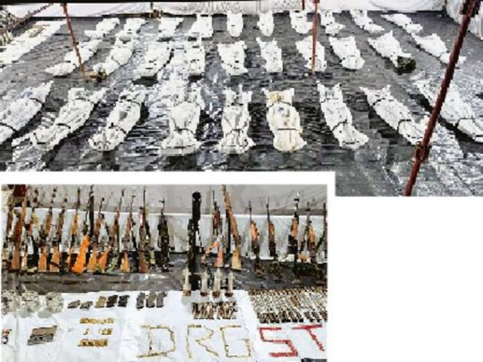 मुठभेड़ में मारे गए 20 पुरुष और 11 महिला माओवादियों के शव और हथियार बरामद