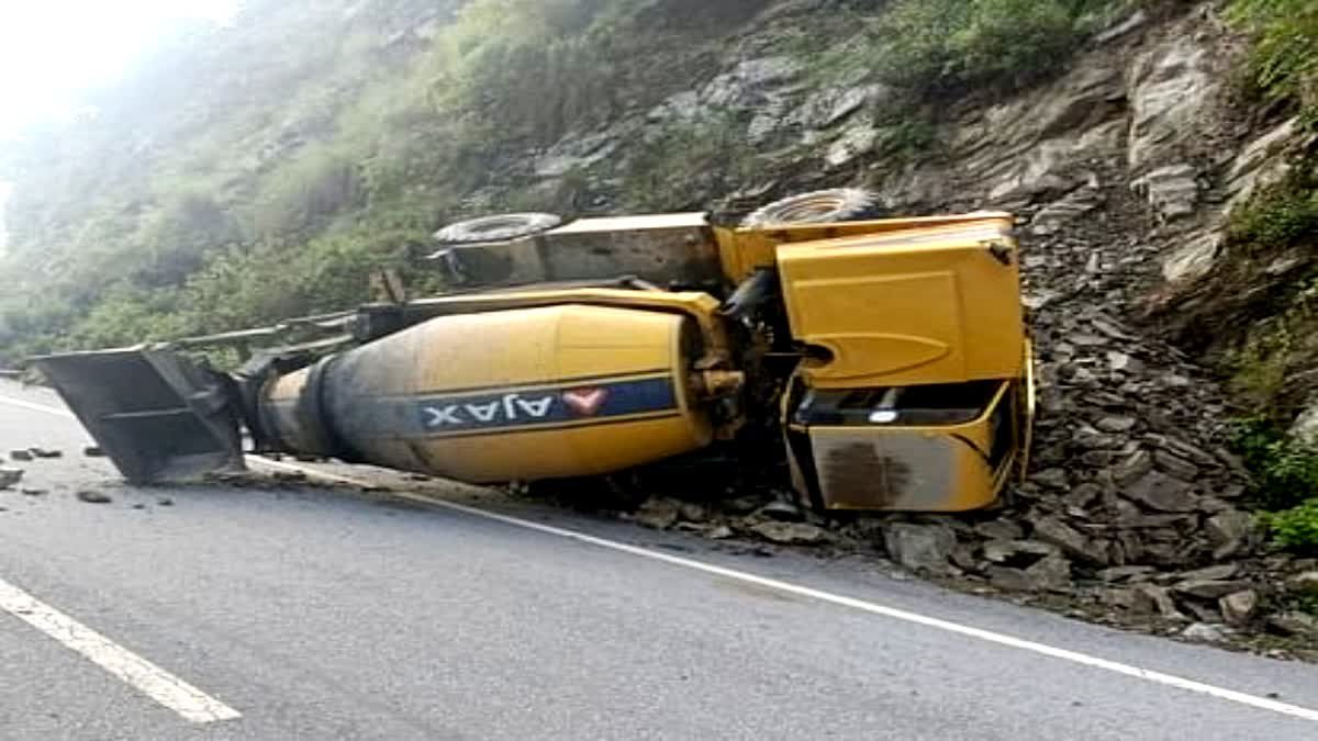 चालक गंभीर घायल चंपावत में अनियंत्रित होकर सड़क पर पलटा मिक्सर वाहन