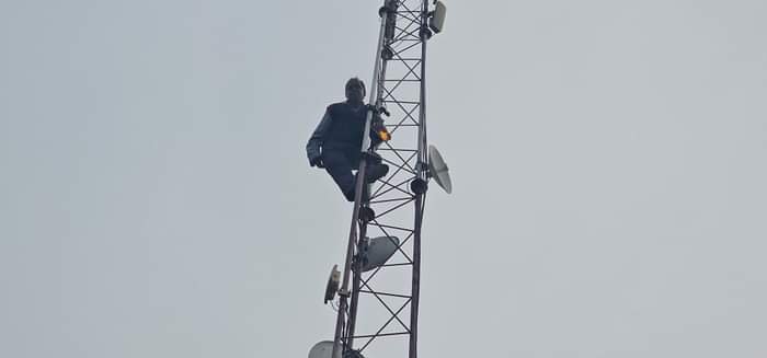 लोगों की लगी भीड़ पेट्रोल की बोतल लेकर मोबाइल टावर पर चढ़ा दुकानदार मचा हड़कंप