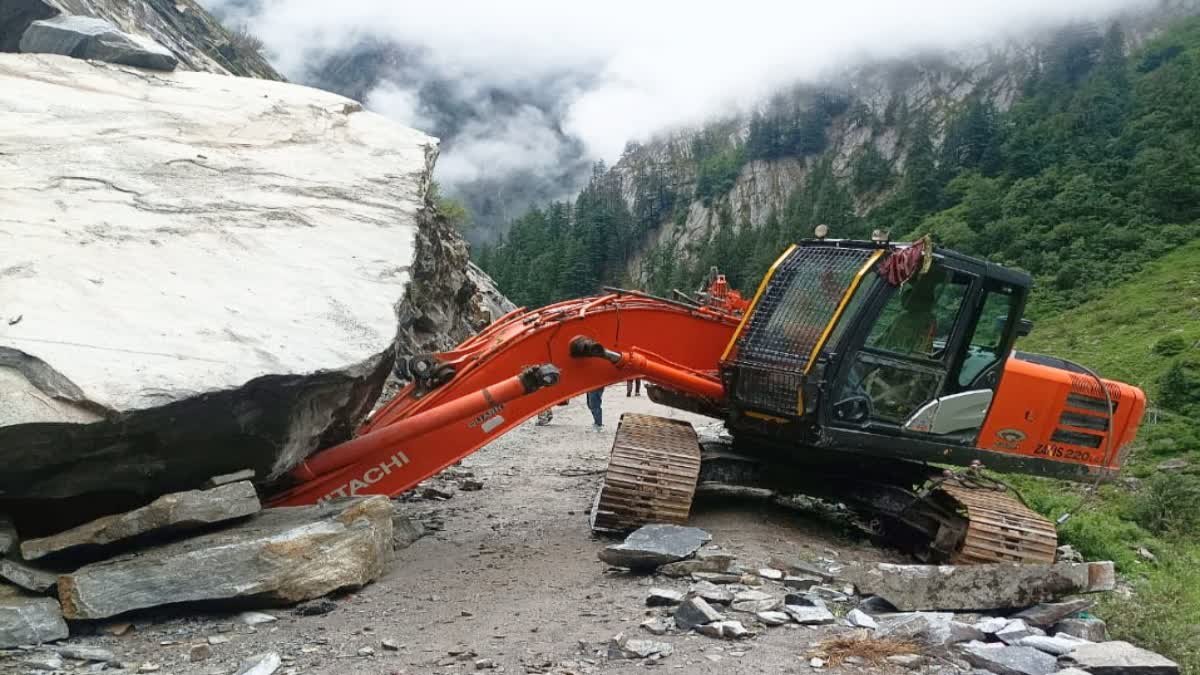 चमोली: बदरीनाथ हाईवे पर हनुमान चट्टी के पास घुडसिल में एक एक्सकेवेटर मशीन (पोकलैंड) के ऊपर पहाड़ी से भारी बोल्डर गिर गए. जिससे हाईवे बाधित हो गया. अब बोल्डर से दबी एक्सकेवेटर मशीन को निकालने और सड़क को खोलने का काम जारी है. वहीं, जोशीमठ तहसील प्रशासन की ओर से हाईवे के दोनों ओर फंसे यात्रियों को जरूरी राहत सामग्री बांटी जा रही है. बारिश से सड़कें हो रही बाधित: पहाड़ों में मानसून की एंट्री होते ही जगह-जगह सड़कों के बंद होने का सिलसिला शुरू हो गया है. जिसका सीधा असर चारधाम यात्रा, तीर्थाटन और पर्यटन पर पड़ रहा है. चमोली जिले में पिछले कई घंटों से रुक-रुक कर बारिश हो रही है. जिसके चलते हाईवे बाधित हो रहा है. बलदौडा पुल के पास हाईवे खुला तो घुडसिल में बंद: बीती रोज भी विष्णु प्रयाग बदरीनाथ मार्ग पर बलदौडा पुल के पास बोल्डर आने से हाईवे बंद हो गया था. जिसे बीआरओ ने आज सुबह वाहनों की आवाजाही के लिए खोला. अब हनुमान चट्टी के पास घुडसिल में एक्सकेवेटर मशीन (पोकलैंड) के ऊपर बोल्डर गिर गया. जिसके चलते बदरीनाथ हाईवे फिर से बाधित हो गया.