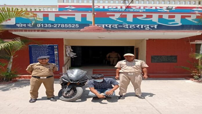जिस पर पुलिस टीम ने थाना रायपुर क्षेत्र के अंर्तगत सघन चेकिंग अभियान चलाया गया। चेकिंग के दौरान सहस्त्रधारा रोड मयूर विहार से घटना को अंजाम देने वाले आरोपी अर्पित कुमार निवासी बिजनौर को चोरी की मोटर साईकिल के साथ गिरफ्तार किया गया। थाना रायपुर प्रभारी कुंदन राम ने बताया आरोपी अर्पित कुमार देहरादून स्थित निजी संस्थान में बीबीए का छात्र है। वर्तमान में डांडा खुदानेवाला में किराये के मकान में रहता है। आरोपी के परिजनों ने उसे स्प्लेंडर मोटरसाइकिल दी है. उसके दोस्तों के पास महंगी मोटर साईकिलें थी। उसने अपनी महिला मित्र को इम्प्रेस करने के लिए यामाहा R1-5 को चोरी की. जिसे वह कुछ दिनों के लिए बिजनौर ले गया। आरोपी ने गांव में नम्बर प्लेट हटाकर कुछ समय बाद देहरादून आ गया।